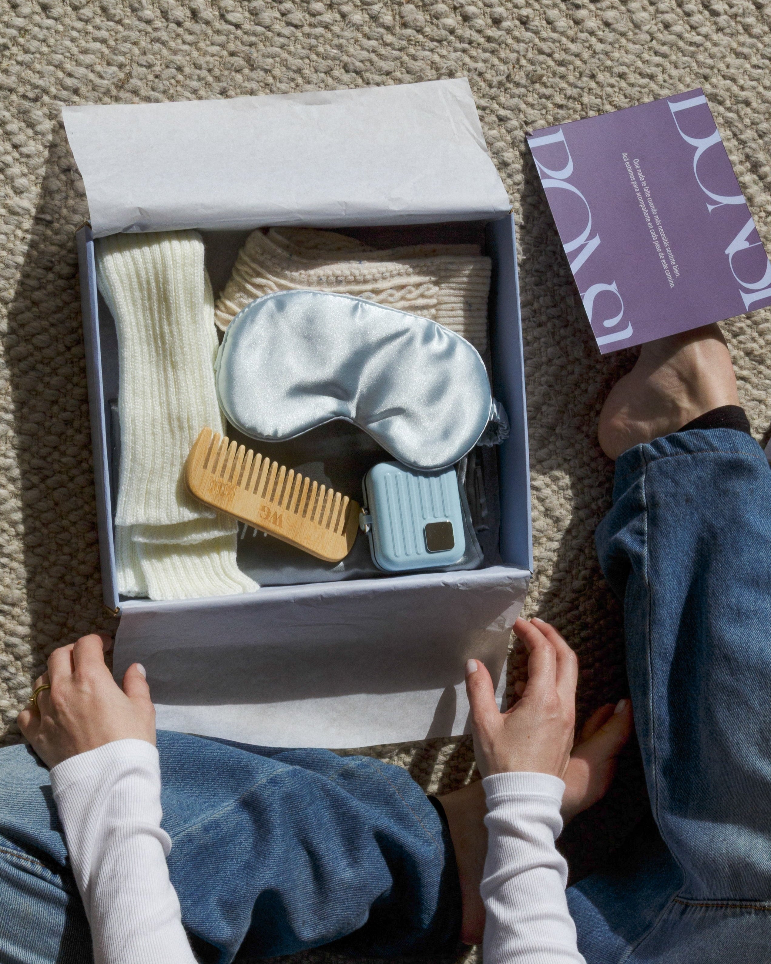 Incluye productos que cuidan el cuerpo con delicadeza: guantes y medias para combatir el frío de cada sesión; un antifaz de satén para favorecer el descanso; una funda de almohada que ayuda a proteger el cabello; un peine de bambú para cabello frágil; y un pastillero práctico para organizar la medicación.