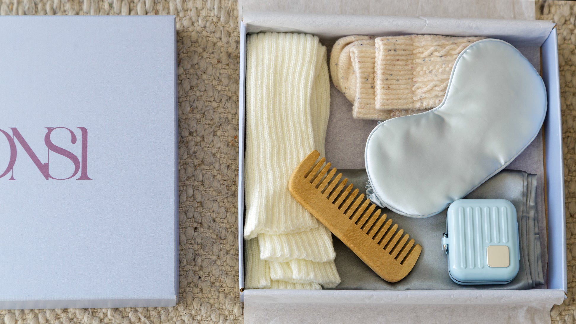 Incluye productos que cuidan el cuerpo con delicadeza: guantes y medias para combatir el frío de cada sesión; un antifaz de satén para favorecer el descanso; una funda de almohada que ayuda a proteger el cabello; un peine de bambú para cabello frágil; y un pastillero práctico para organizar la medicación.